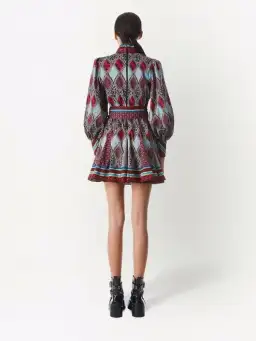 Red/multicolour stretch-cotton Mina button-front godet mini dress from Alice + Olivia featuring geometric print, ruffle collar, front button fastening, rear zip fastening, bell sleeves, tied waist and flared skirt.