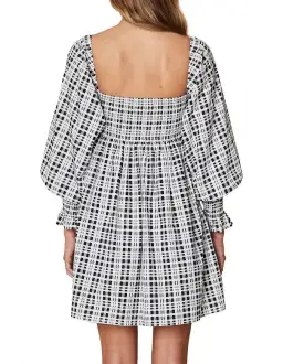 A lightweight cotton poplin mini dress, with checked print in a monochromatic colourway. Styled with a flattering ruched bodice to the square neckline.