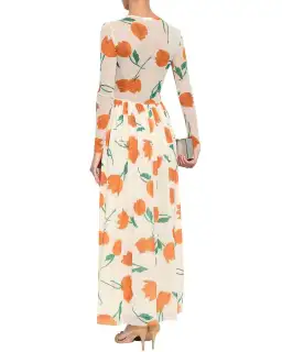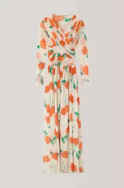 Tilden crossover floral-print long sleeved mesh maxi dress. Beautiful cream coloured dress with a gorgeous orange tulip print. Mesh and wrap detail so it's not revealing - partially lined, including a lined skirt.