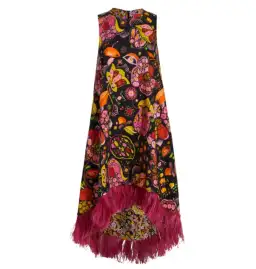 From the Edition 29 Collection, this updated La Scala dress has a gorgeous A-Line shape, an elevated high neck, a playful asymmetric hemline, and it’s adorned with fluffy ostrich feathers and a bright print. Back zip closure.