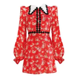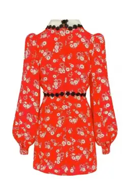 The Mary mini dress from Queens of archive brings drama. It has a dagger collar with contrast daisy trim and bell sleeves that create volume as a contradiction to the fitted waist. Contrast daisy trim adorns the bodice and waist, standing out against the eye-catching red colour of the piece.