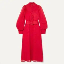 Emerging from Birger Christensen’s ROTATE collection, the ‘Number 37’ dress in ‘high risk red’ offers its wearer a relaxed, elegant silhouette. Crafted from a fine fil coupé chiffon material, the red dress has a tonal satin lining throughout the flowing skirt and top, leaving the sleeves to maintain their sheer quality. Cut with loose sleeves that drape from the gathered shoulder seams and tighten into fitted cuffs. Featuring a high neck and fabric covered buttons along the front and cuffs. The non-stretch midi dress comes with a belt for a more defined fit