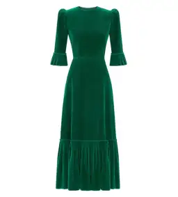 The label founded by Susie Cave, is influenced by vintage shapes but always rendering them contemporary through clever, flattering tailoring and tactile, unusual fabrics, the dresses are fought over by celebrity and fashion editor alike. The Festival dress reimagines the label’s renowned ruffle-sleeved silhouette in corduroy. The midi-length skirt is flouncy and frilled and the ¾ sleeves are finished with ruffled cuffs. Lined in pure silk, it is a luxury to wear.